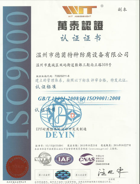 公司自創(chuàng)業(yè)以來,一直以“以顧客為關(guān)注焦點(diǎn)、領(lǐng)導(dǎo)作用、全員參與、過程方法、系統(tǒng)管理、持續(xù)改進(jìn)、基于事實(shí)的決策方法、與供方互利的關(guān)系”八項(xiàng)質(zhì)量管理原則指導(dǎo)企業(yè)的質(zhì)量保證體系建設(shè)。制定“以一流的質(zhì)量和一流的服務(wù),參加國際市場競爭,并持續(xù)改進(jìn)?!钡馁|(zhì)量方針。叢2001年8月27日至今一直通過萬泰(WIT)認(rèn)證中心頌發(fā)的ISO9001:2008質(zhì)量體系認(rèn)證,并獲得證書(證書號:15/14Q6404R41),并按照ISO9001:2008的要求進(jìn)行持續(xù)性的改進(jìn)。